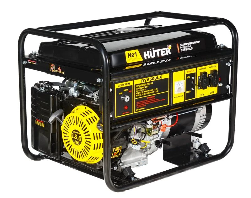Бензиновый генератор Huter DY6500LX – портативная компактная однофазная электростанция переменного тока, номинальной мощностью 5 кВт. Электрогенератор Huter DY6500LX оснащён системой управления основными параметрами электричества, автоматически стабилизирующей выходное напряжение и частоту тока, с максимальной погрешностью не более 2.5%.