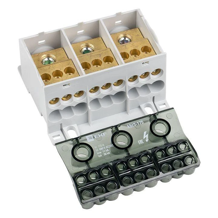 Блок распределительный КБР EKF PROхima предназначен для обеспечения удобного распределения питания в шкафах и используется в качестве переходного клеммника для подключения кабельной жилы большего сечения к нескольким проводникам меньшего сечения, а также для организации главной заземляющей шины (ГЗШ).