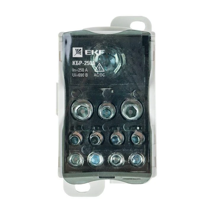 Блок распределительный КБР EKF PROxima предназначен для обеспечения удобного распределения питания в шкафах и используется в качестве переходного клеммника для подключения кабельной жилы большего сечения к нескольким проводникам меньшего сечения, а также для организации главной заземляющей шины (ГЗШ).