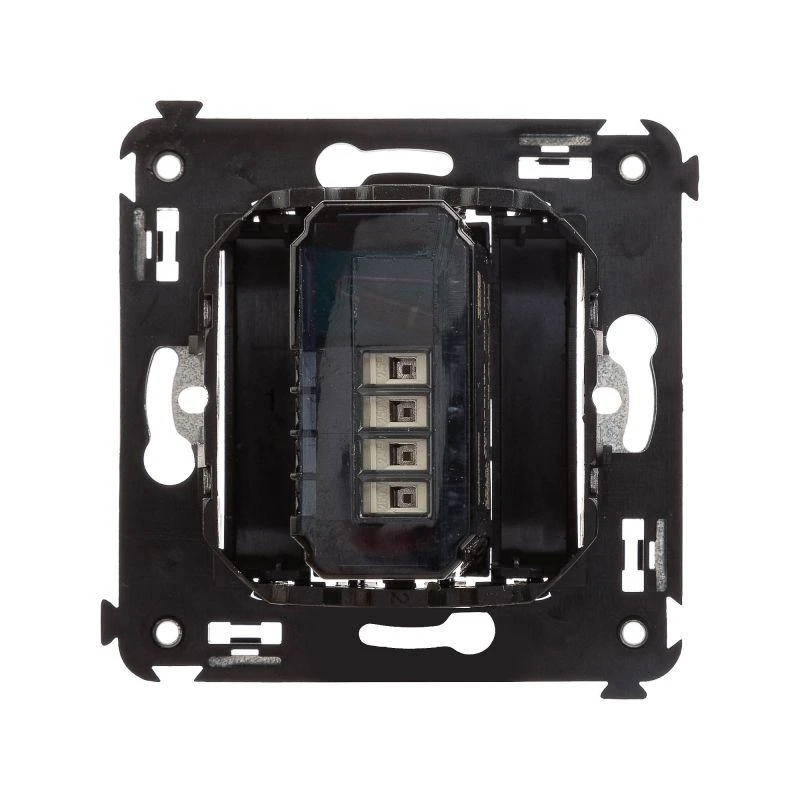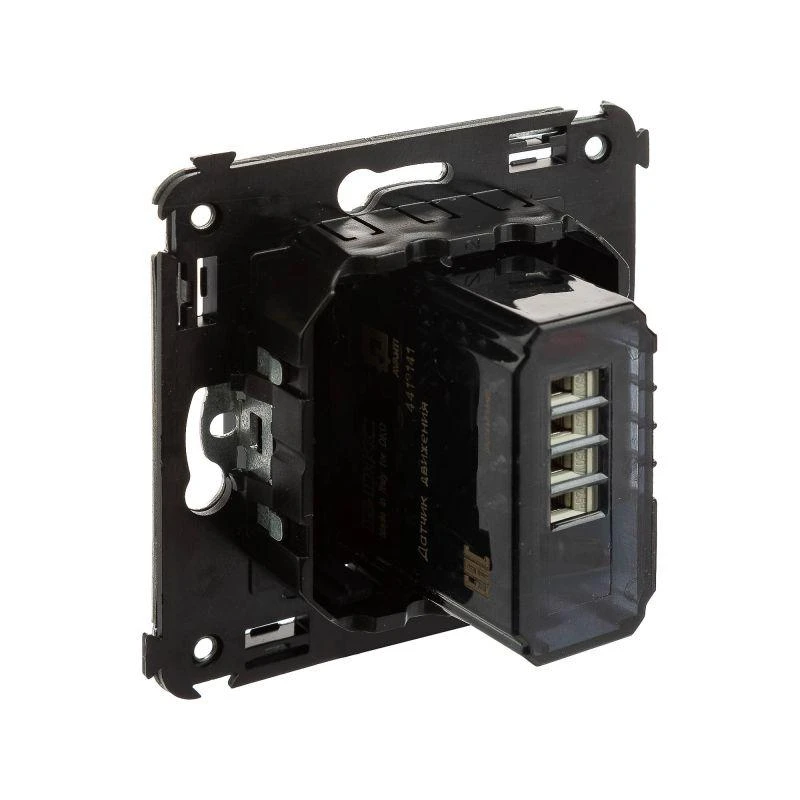 Датчик движения. Назначение: для монтажа в подрозеточные коробки глубиной не менее 45 мм (код 59301). Используется для автоматического включения/выключения света. Характеристики: диаметр отверстий для ввода кабелей – 3 мм; винтовые зажимы; шаблон для зачистки кабеля – 11 мм; расстояние обнаружения – от 2 до 12 м; угол охвата – 150°; время задержки отключения – от 10 с до 7 мин.; настройка светочувствительности датчика; настройка порога освещенности. Фиксация производится в подрозеточные коробки глубиной не менее 45 мм при помощи каркаса с лапками (код 4400802) и саморезов. Цвет: "Черный матовый".