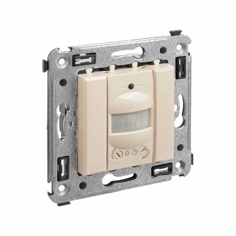 Датчик движения. Назначение: для монтажа в подрозеточные коробки глубиной не менее 45 мм (код 59301). Используется для автоматического включения/выключения света. Характеристики: диаметр отверстий для ввода кабелей – 3 мм; винтовые зажимы; шаблон для зачистки кабеля – 11 мм; расстояние обнаружения – от 2 до 12 м; угол охвата – 150°; время задержки отключения – от 10 с до 7 мин.; настройка светочувствительности датчика; настройка порога освещенности; фиксация в подрозеточные коробки глубиной не менее 45 мм при помощи каркаса с лапками (код 4400802) и саморезов. Цвет: "Ванильная дымка".