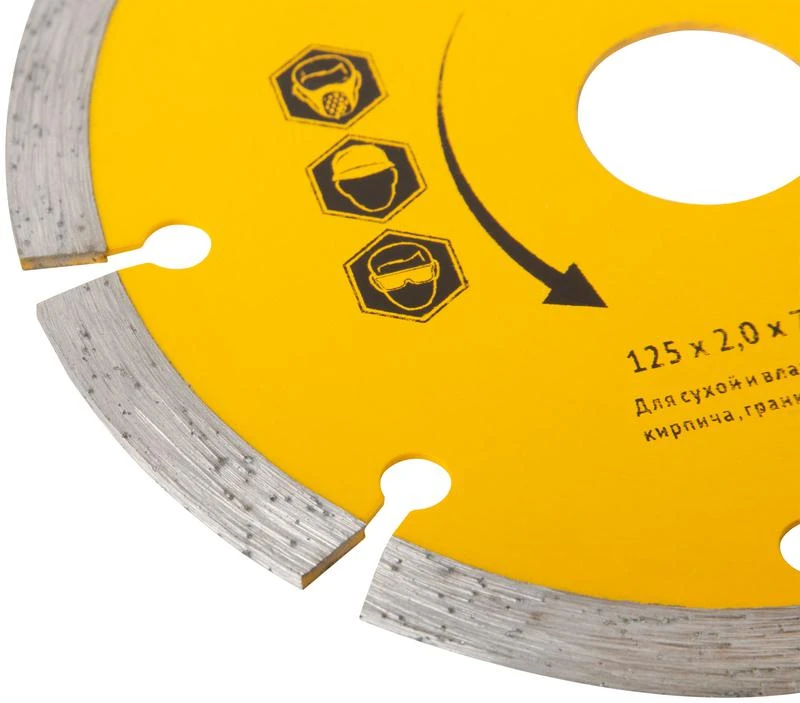 Сегментный, для сухой и влажной резки. Применяется для резки бетона, кирпича, гранита, мрамора и камня. Высота алмазной режущей кромки 7,5 мм. Посадочный диаметр 22,2 мм. Материал: высококачественная инструментальная сталь, режущая кромка содержит порошок из технических алмазов. Упаковка: картонный конверт.