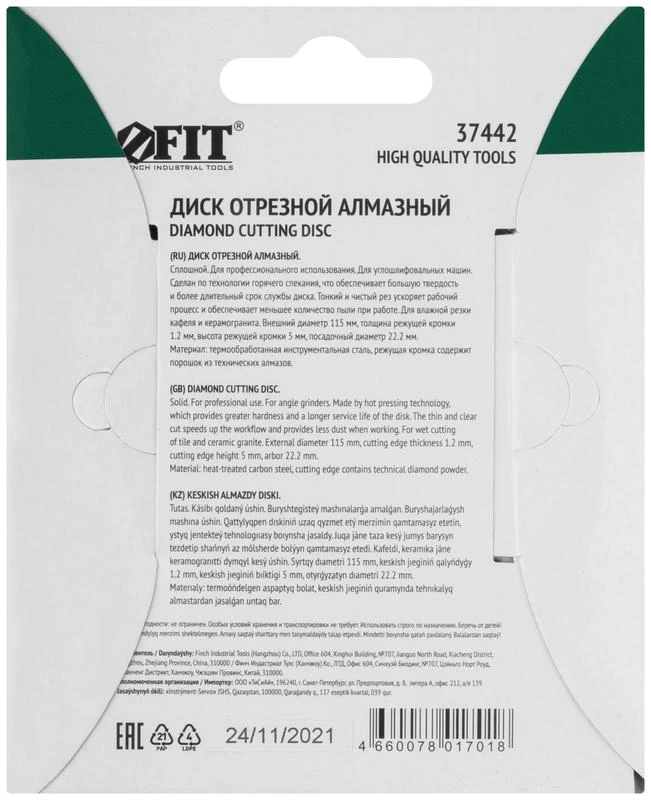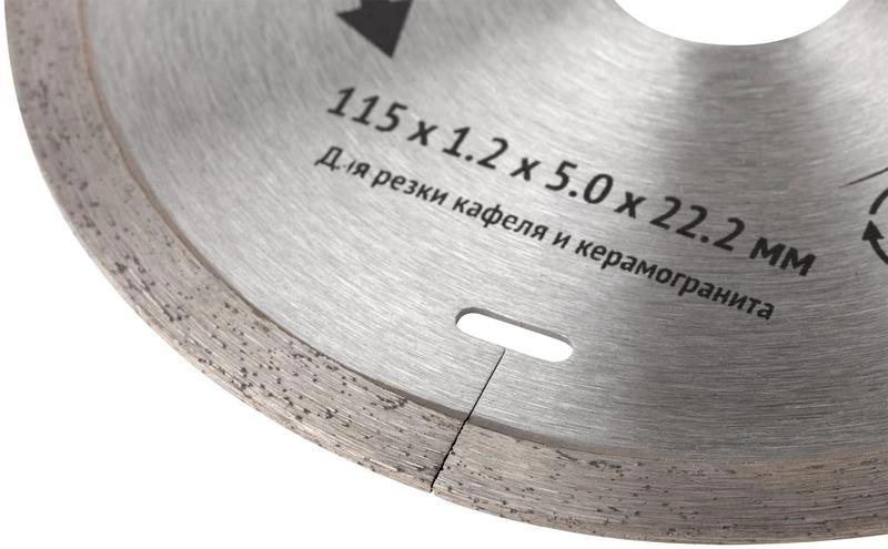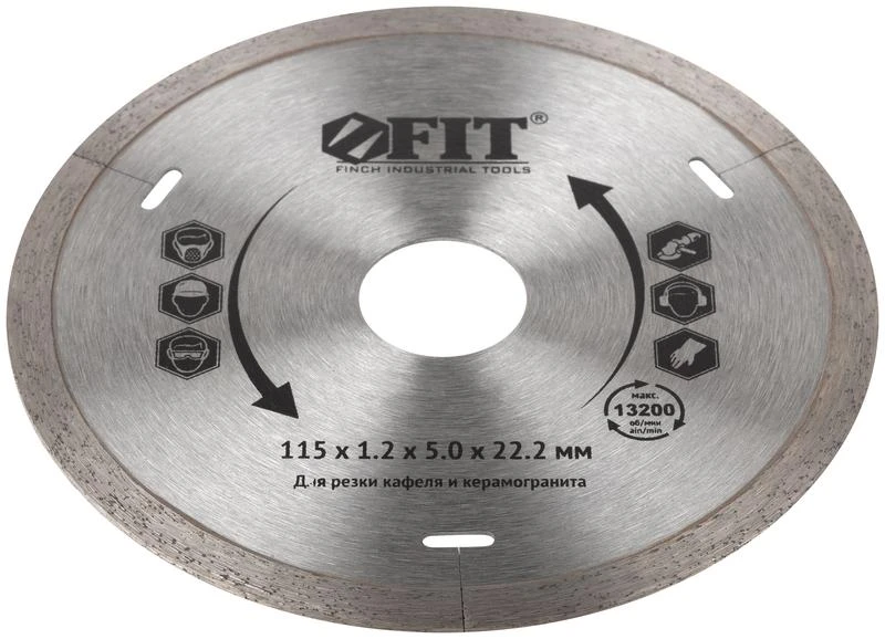 Диск отрезной алмазный сплошной (влажная резка) для работы с кафелем 115х1.2х5.0х22.2мм FIT 37442