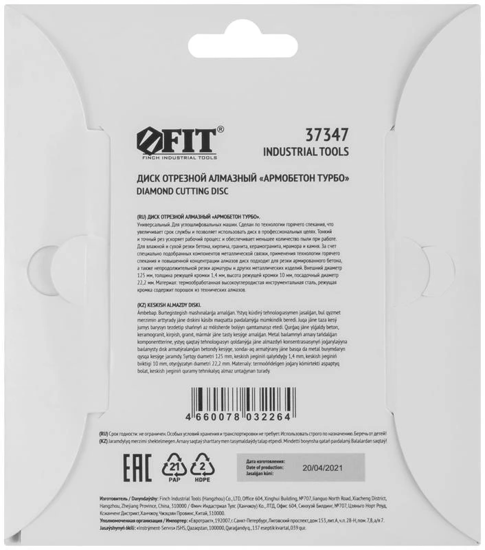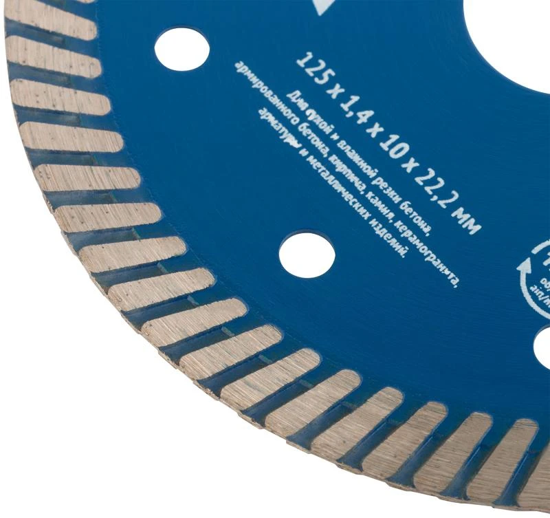 «Армобетон турбо». Тонкий рез. Универсальный. Для сухой и влажной резки бетона, кирпича, гранита, керамогранита, мрамора и камня. За счёт специально подобранных компонентов металлической связки, применения технологии горячего спекания и повышенной концентрации алмазов диск подходит для резки армированного бетона, арматуры и других металлических изделий. Высота алмазной режущей кромки 10 мм. Посадочный диаметр 22,2 мм. Предназначен для углошлифовальных машин. Материал: высокоуглеродистая инструментальная сталь, режущая кромка содержит порошок изтехнических алмазов. Упаковка: картонный конверт.
