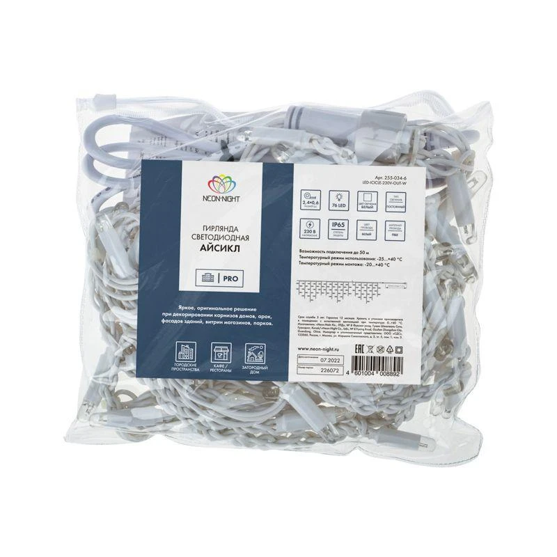 Гирлянда светодиодная "Айсикл" (бахрома) 2.4х0.6м 76LED бел. 7Вт 230В IP65 провод бел. (нужен шнур питания 303-500-1) Neon-Night 255-034-6