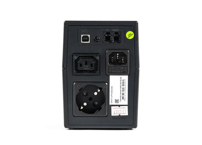 220 В, 600 ВА, (350 Вт), встроенный АКБ 7 Ач, время резерва — 3 мин., холодный старт, модифицированный синус, световая и звуковая индикация режимов работы, связь и управление ПК по USB. Встроенный стабилизатор (диапазон сети — 170...270 В), защита от всплесков напряжения, защита от перегрузки. 2 выходных разъёма: 1 шт. IEC 320 C13 (компьютерный), 1 шт. CEE 7/4 (розетка с заземлением).