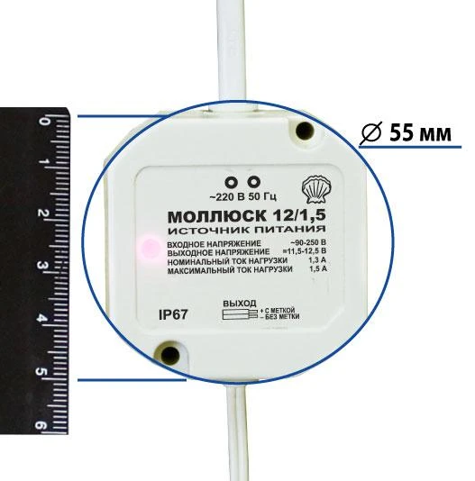 12 В, 1,5 А. Расширенный сетевой диапазон — 90...250 В, габариты — 50х50х25 мм, скругленные края O 55 мм, защита выхода от КЗ и перегрузки, прочность изоляции 3 кВ, отверстия для крепления, корпус IP67. Обновление модели: Белый корпус, светодиодная индикация.
