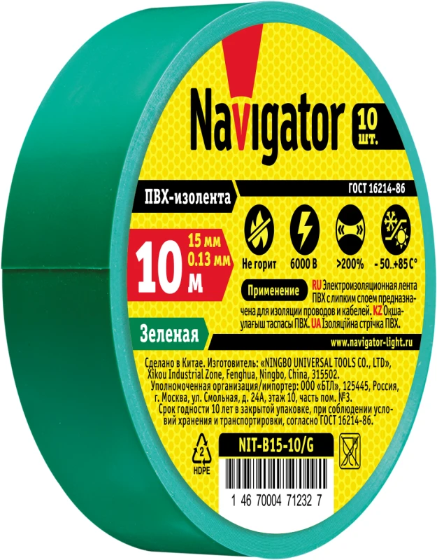 Изолента ПВХ 15мм (рул.10м) зел. NIT-B15-10/G Navigator 71232