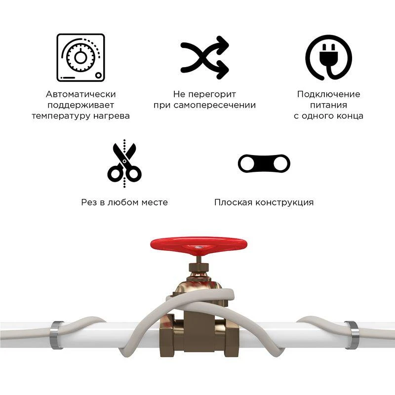 Саморегулируемый греющий кабель предназначен для защиты от замерзания бытовых трубопроводов среднего диаметра, счетчиков воды, вентилей и т.п. Предназначен для устройства на трубопроводах, диаметром не более 150 мм. Длина и мощность электрообогревателя выбирается исходя из длины трубы и толщины.