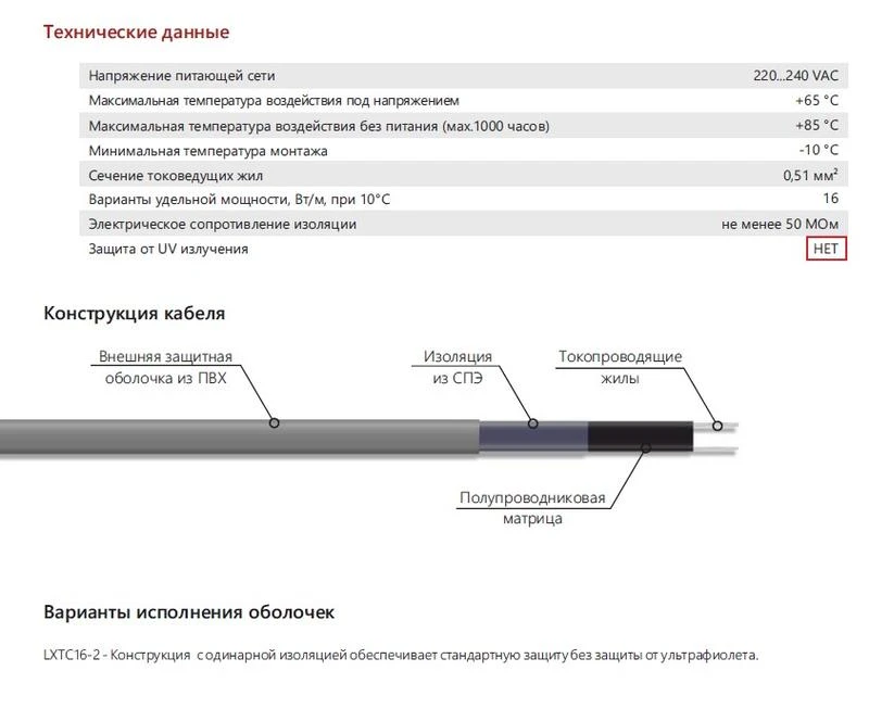 Кабель нагревательный саморег. 16Вт/м 17AWG бытового применения для стальных трубопроводов неэкранир. термопласт Extherm LXTC16-2