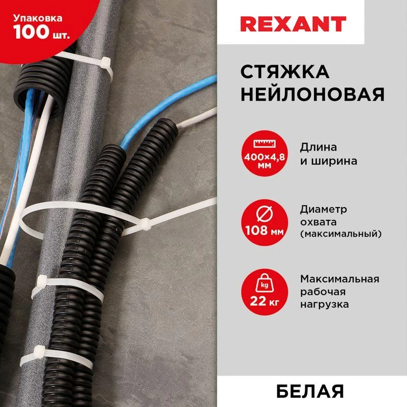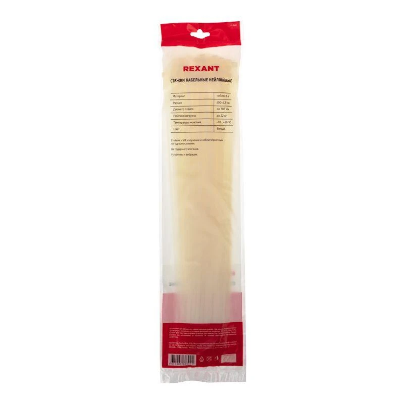 Хомут нейлоновый (кабельная стяжка) 400х4,8 мм белый REXANT предназначен для крепления или обвязки в жгут кабелей и проводов, крепления гибких гофротруб, а также других предметов к несущей поверхности или для соединения между собой. Такая стяжка используется при проведении электромонтажных работ, при монтаже структурированных кабельных систем, для бытовых нужд, а также в других отраслях народного хозяйства.