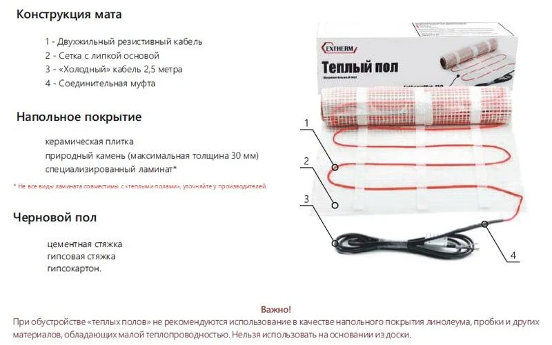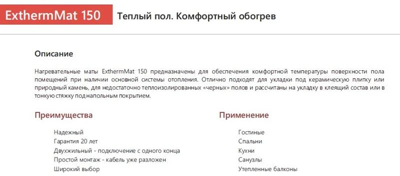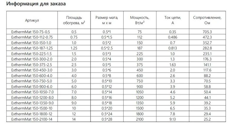Комплект "Теплый пол" (мат) двухжил. 150Вт/кв.м ExthermMat 150-75-0.5