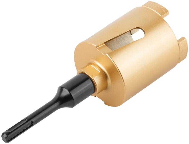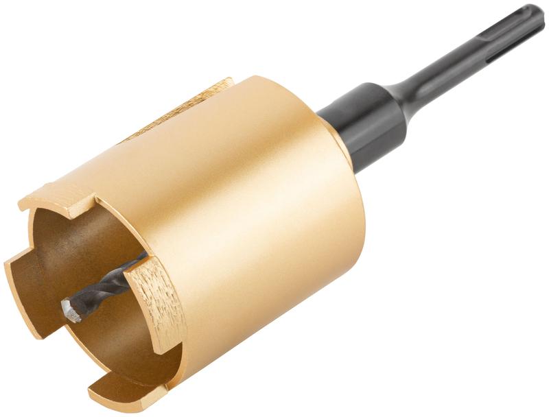 Коронка алмазная с центрирующим сверлом и хвостовиком SDS-PLUS. Для безударного сверления отверстий под монтажные коробки в бетоне и кирпиче. Для работы с водяным охлаждением. Материал: корпус из инструментальной стали, хвостовик и центрирующее сверло из легированной стали, режущая кромка содержит порошок из технических алмазов. Упаковка: пластиковый подвес.