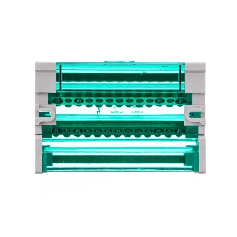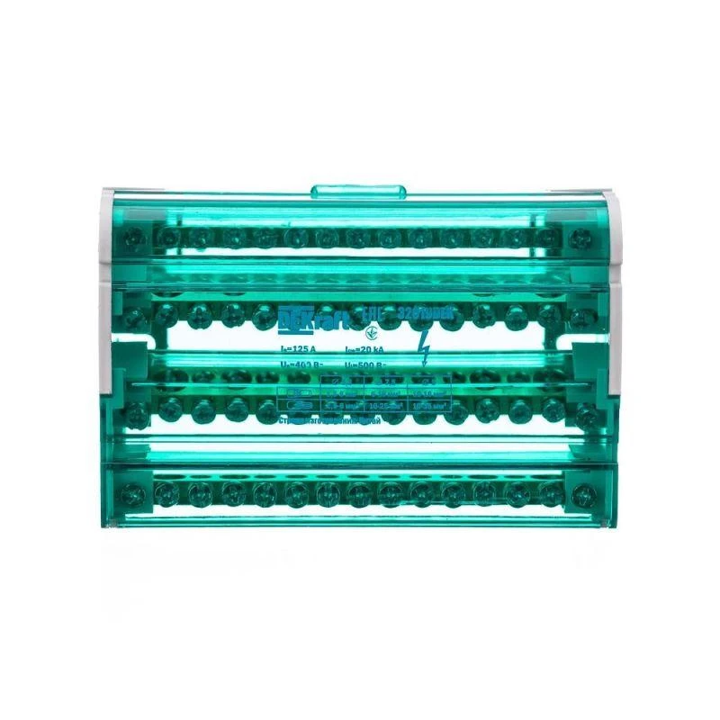 Кросс-модуль серии ШН-103 DEKraft; номинальный ток - 125 А; исполнение – 4 ряда по 15 отверстий (11х5,3 + 2x7,5 + 2x9,0); материал корпуса – нагревостойкий пластик; материал шин – высококачественная электротехническая бронза; каждая шина отдельно изолирована; цвет крышки – зеленый; установка – на DIN-рейку 35 мм или на монтажную панель двумя винтами M4; степень защиты - IP20. Применение кросс-модулей в щите обеспечивает компактную разводку кабелей и защиту от прикосновения к токоведущим частям.