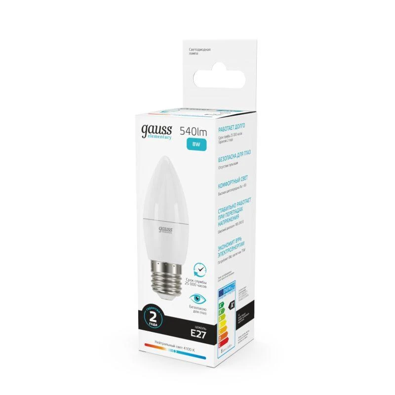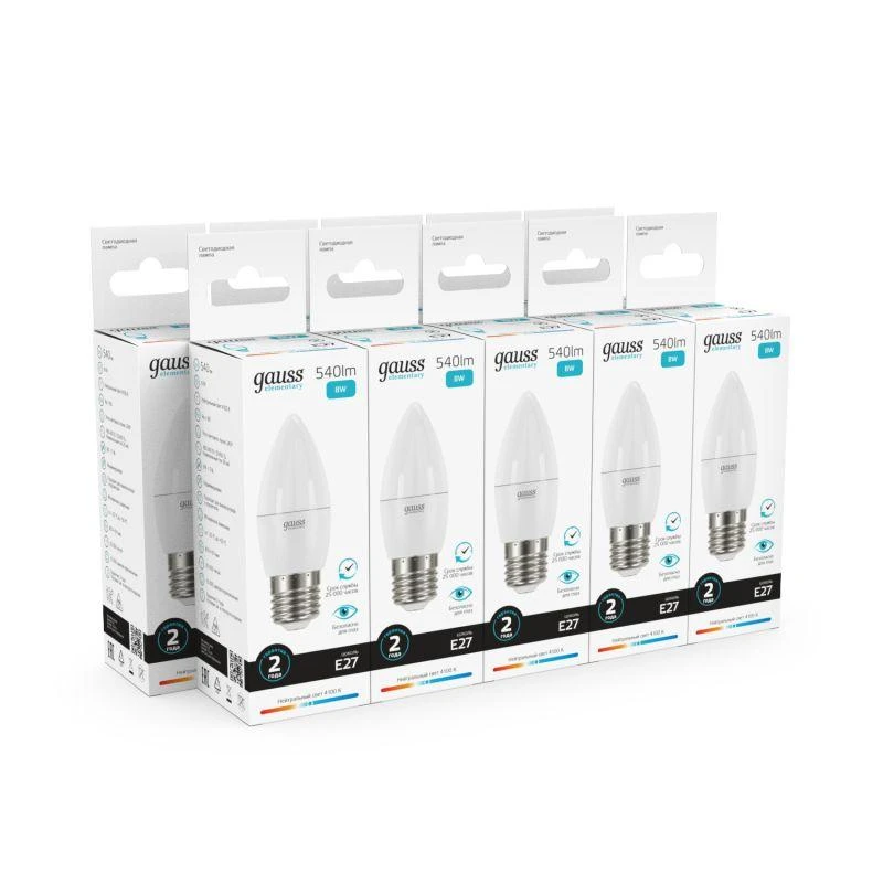 Лампа светодиодная Elementary 8Вт свеча 4100К нейтр. бел. E27 540лм GAUSS 33228
