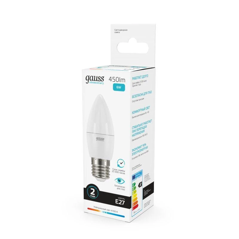 Лампа светодиодная LED Elementary Candle 6Вт E27 4100К Gauss 33226 – лампа с колбой вида "свеча", белого света, длиной 112 мм, диаметром 37 мм, с цоколем Е27, мощностью 6 Вт. Цветовая температура 4100 К.