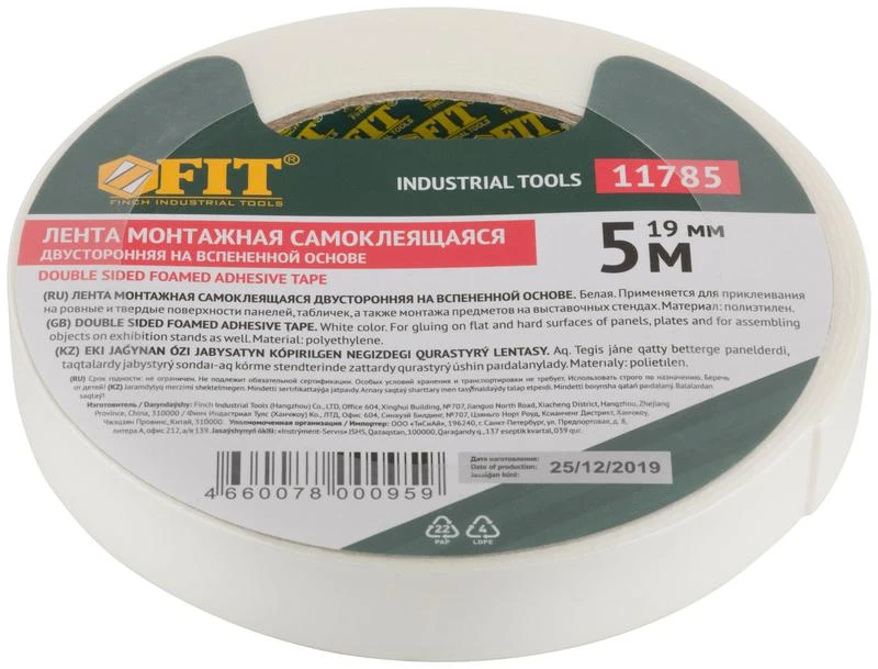 Лента клеящая 2-х сторонняя монтажная на вспененной основе 19ммх5м бел. FIT 11785