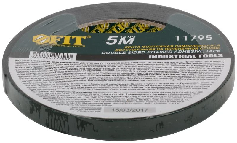 Лента клеящая 2-х сторонняя монтажная на вспененной основе с полимерной подложкой 12ммх5м FIT 11795