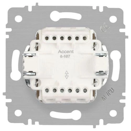 Переключатель 2-клавишный серии Intro Accent скрытой установки механизм цвет белый матовый 6-107-01М. Номинальные характеристики 10А 250В. Выполнен из негорючего термопласта, оснащён винтовыми клеммами. Парные клеммы обеспечивают соединение шлейфом. Монтаж в подрозетник производится и на лапки, и на винты. Рамка приобретается отдельно. В серии представлены рамки до 5 постов: на 1 пост - 6-501-хх, на 2 поста - 6-502-хх, на 3 поста - 6-503-хх, на 6 поста - 4-504-хх, на 5 постов - 6-505-хх (где хх - цветовой код: 01 - белый, 01М - матовый белый, 02 - слоновая кость, 03 - алюминий, 04 - шампань, 05 - антрацит, 06 - перламутр, 07 - графит, 08 - бронза, 09 - титан, 10 - венге, 11 - сосна).