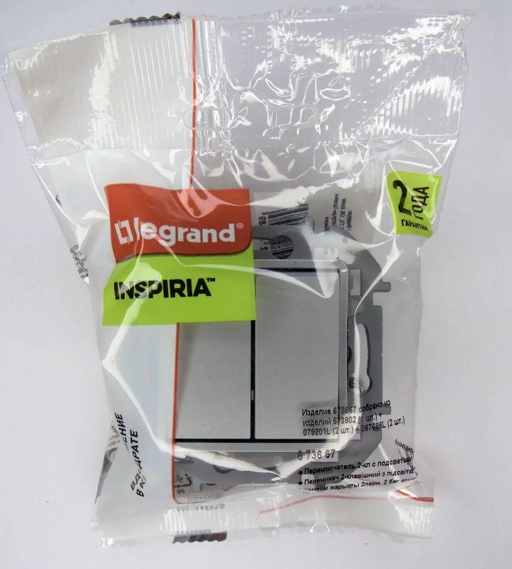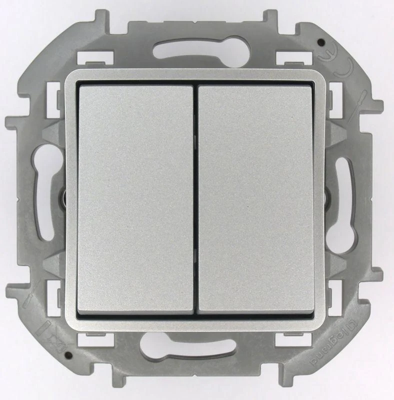 Переключатель модульный двухклавишный с подсветкой Legrand Inspiria для скрытого монтажа, цвет "Алюминий", номинальный ток 10 А, напряжение ~250В.