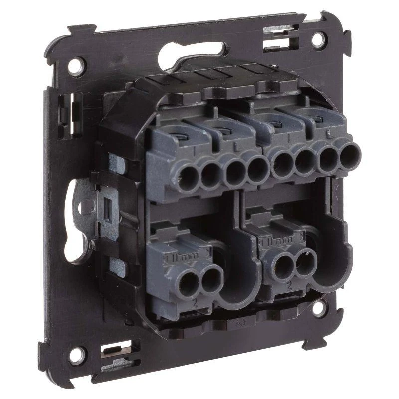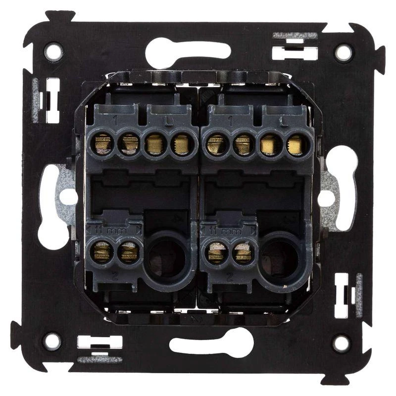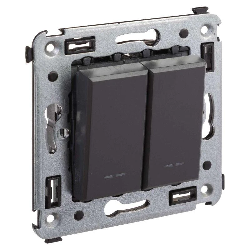 Переключатель двухклавишный в стену серии "Avanti". Предназначен для монтажа в подрозеточные коробки (код 59301). Используется для включения/выключения освещения из двух мест. Диаметр отверстий для ввода кабелей – 3 мм (по 2 отверстия на одну клемму); винтовые зажимы; шаблон для зачистки кабеля – 11 мм. Номинальный ток – 16 A. Номинальное напряжение – 230 В. Для оснащения подсветкой необходимо заказать 2 лампы. Фиксация в подрозеточную коробку производится при помощи саморезов; 2 модуля. Цвет: "Черный матовый".