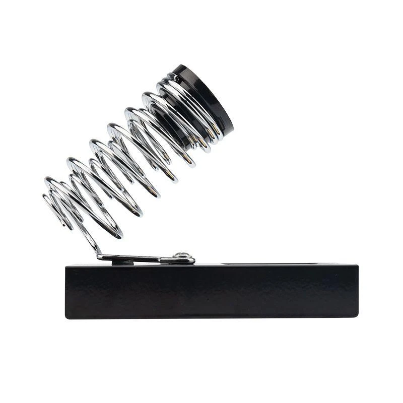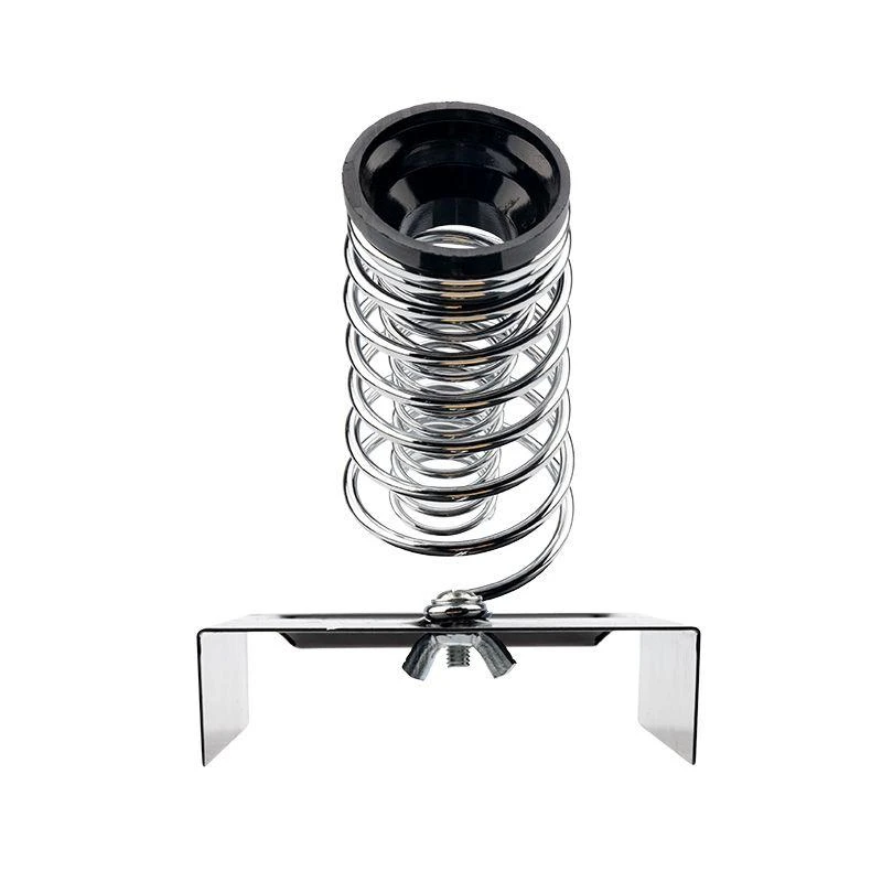Выполнена из витой хромированной конусообразной пружины и металлической платформы с ложементом под губку для очистки жала паяльника от остатков припоя. Губка для очистки жала паяльника в комплекте.