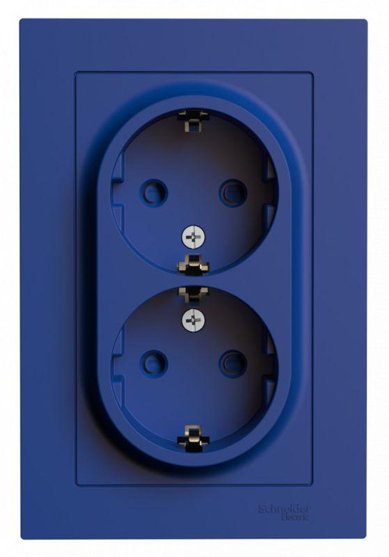 Розетка двойная Systeme Electric (ранее Schneider Electric) серии AtlasDesign (в сборе, цвет аквамарин) с заземлением и шторками подходит для сетей 250 В, на ток 16 А.