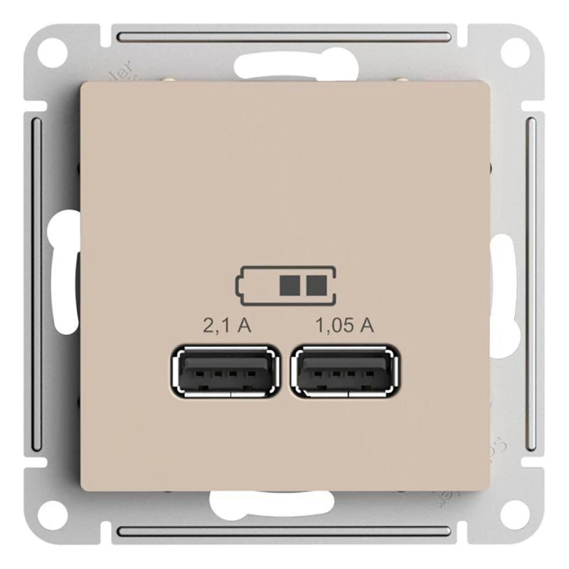 Механизм Systeme Electric (ранее Schneider Electric) серии AtlasDesign в цвете песочный розетки для зарядки с двумя разъёмами USB с выходными напряжением 5 В постоянного тока и выходами с номинальным током по 2,1 А. USB розетка позволяет напрямую заряжать одно или два мобильных устройства. Лицевые детали из качественного ABS-пластика, устойчивого к царапинам и УФ-излучению. Усиленные прямые монтажные лапки для лучшей фиксации механизма в монтажной коробке.