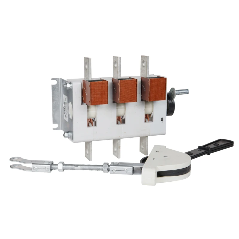 Выключатель-разъединитель 3 полюсный на номинальный ток 630 А, в котором установлена несъемная рукоятка.