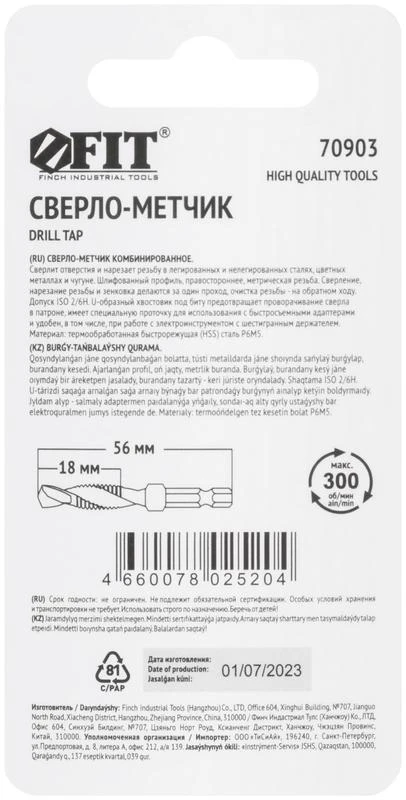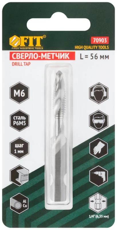 Сверло-Метчик комбинированное метрическое быстрорежущая (HSS) сталь Р6М5 М6х1.0мм 18/56мм FIT 70903