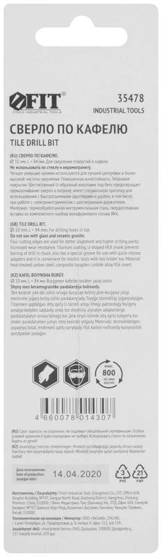 Сверло по кафелю 4 режущие кромки титан. покрытие U-хвостовик под биту 10х84мм FIT 35478