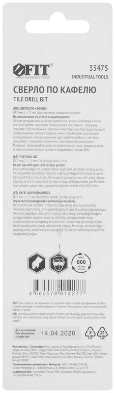 Сверло по кафелю 4 режущие кромки титан. покрытие U-хвостовик под биту 5х71мм FIT 35475