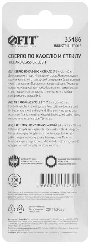 Сверло по кафелю и стеклу 4 режущие кромки титан. покрытие 6х60мм FIT 35486
