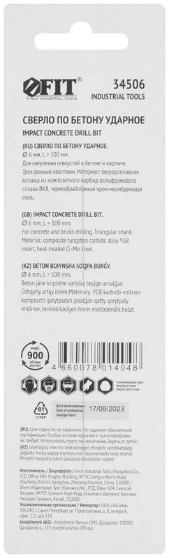 Сверло победитовое ударное трехгранный хвостовик (для бетона кирпича) 6х100мм FIT 34506