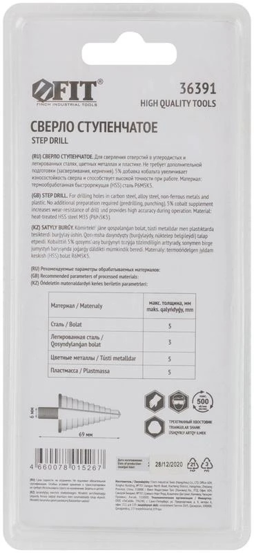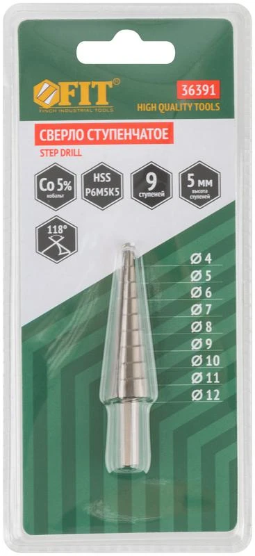 Сверло ступенчатое HSS Co5% (Р6М5К5) по металлу 9 ступеней 4-12мм FIT 36391
