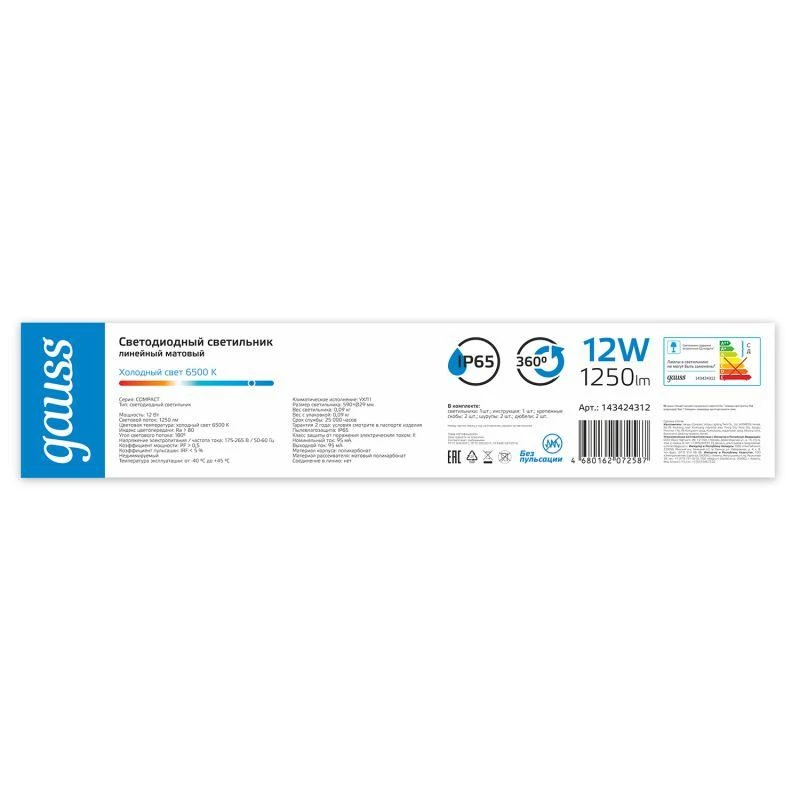 Светильник светодиодный 590х29х29мм 12Вт 6500К 1250лм IP65 COMPACT линейный матов. GAUSS 143424312
