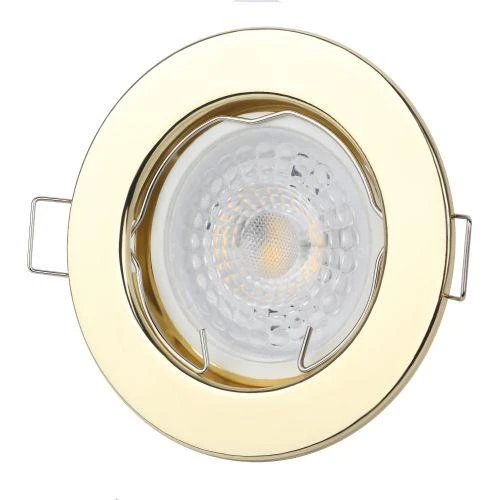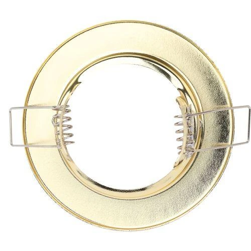 Изготовлен из стали, золотистого цвета. Округлой формы, плоский, с неподвижной внутренней частью с золотистым ободом по окружности. Диаметр 80 мм, диаметр отверстия 60 мм, с цоколем GU5.3.