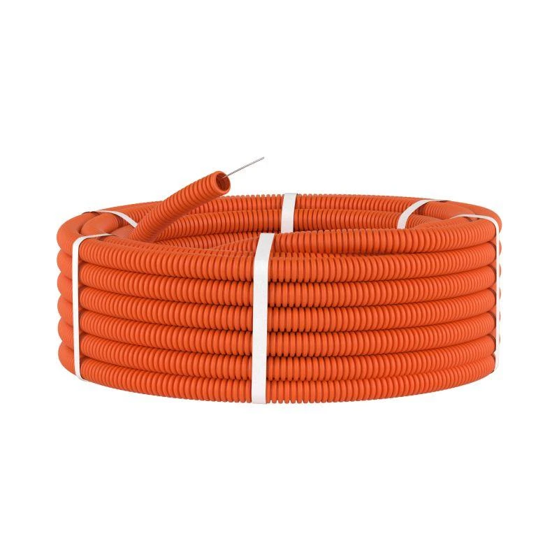 Гибкая гофрированная труба предназначена для прокладки в ней электрических, компьютерных, телевизионных кабелей. Она имеет проволочную протяжку для упрощения прокладки кабеля. Труба такого типа отличается повышенной прочностью и может использоваться в монолитном бетоностроении и для скрытой прокладки в стяжке полов (при этом основание должно быть выполнено из несгораемого материала) или же в штробах стен. Труба обеспечивает степень пыле- и влагозащиты до IP 55 (при использовании специальных аксессуаров), устойчива к старению. Диаметр трубы – 16 мм. Материал – полиэтилен низкого давления (ПНД).Тяжелые гибкие гофрированные трубы могут монтироваться и эксплуатироваться при широком диапазоне температур: - от -40°C до +90°C. Цвет - оранжевый. Длина – 100 метров.