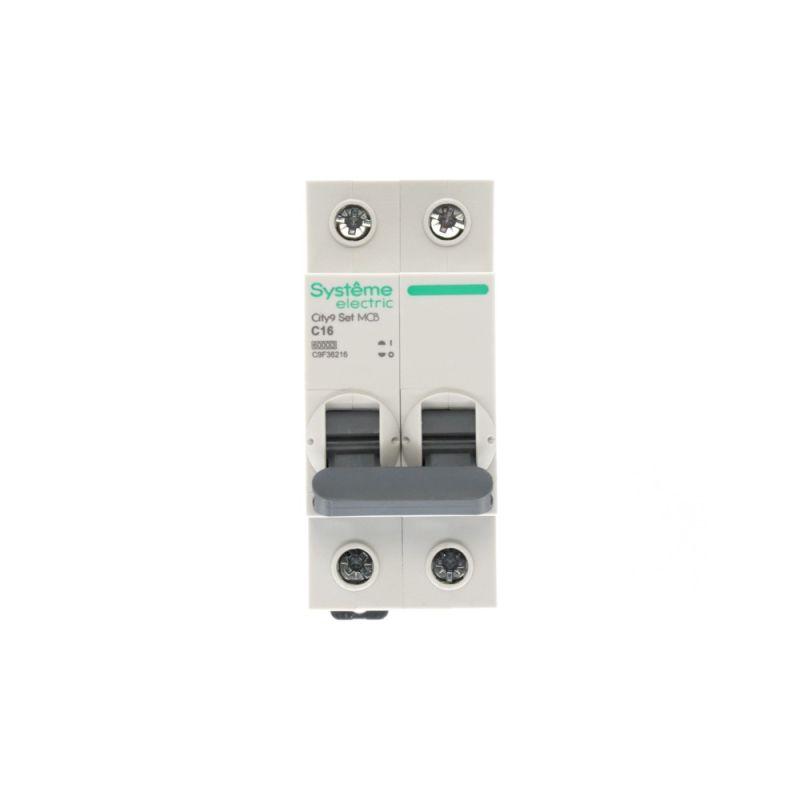 Автоматический выключатель серии City9 Set Systeme Electric, 2-полюсный, номинальный ток 16 А, характеристика С, Icn = 6 кА. Применяется в электрических сетях напряжением 230 В. Предназначен для защиты от перегрузок и токов короткого замыкания. Оснащен механизмом «мгновенной коммутации». Ударопрочный корпус из специального пластика с 6 металлическими заклепками. Безопасные клеммы исключают попадание кабелей в заклеммное пространство.