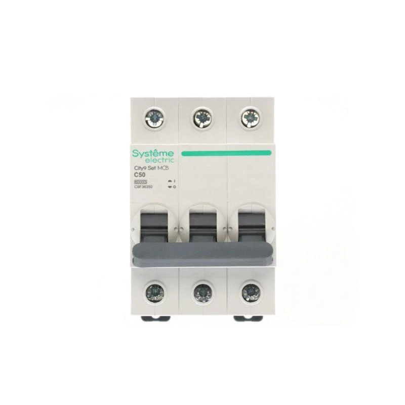 Автоматический выключатель серии City9 Set Systeme Electric, 3-полюсный, номинальный ток 50 А, характеристика С, Icn = 6 кА. Применяется в электрических сетях напряжением 400 В. Предназначен для защиты от перегрузок и токов короткого замыкания. Оснащен механизмом «мгновенной коммутации». Ударопрочный корпус из специального пластика с 6 металлическими заклепками. Безопасные клеммы исключают попадание кабелей в заклеммное пространство.