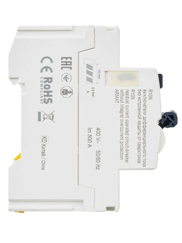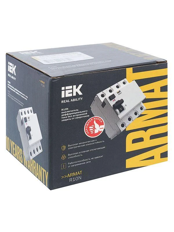 Выключатели дифференциального тока ARMAT серии R10N выполняют функцию защиты поражения человека электрическим током, а так же защиты от пожара при возникновении замыкания на землю. Модельный ряд включает в себя устройства с типами защитных характеристик по дифференциальному току AC, A, AC-S, A-S; номинальными токами от 25 до 100 А; номинальными дифференциальными токами срабатывания от 10 до 300мА. Условная отключающая способность ВДТ ARMAT серии R10N составляет 10 кА.