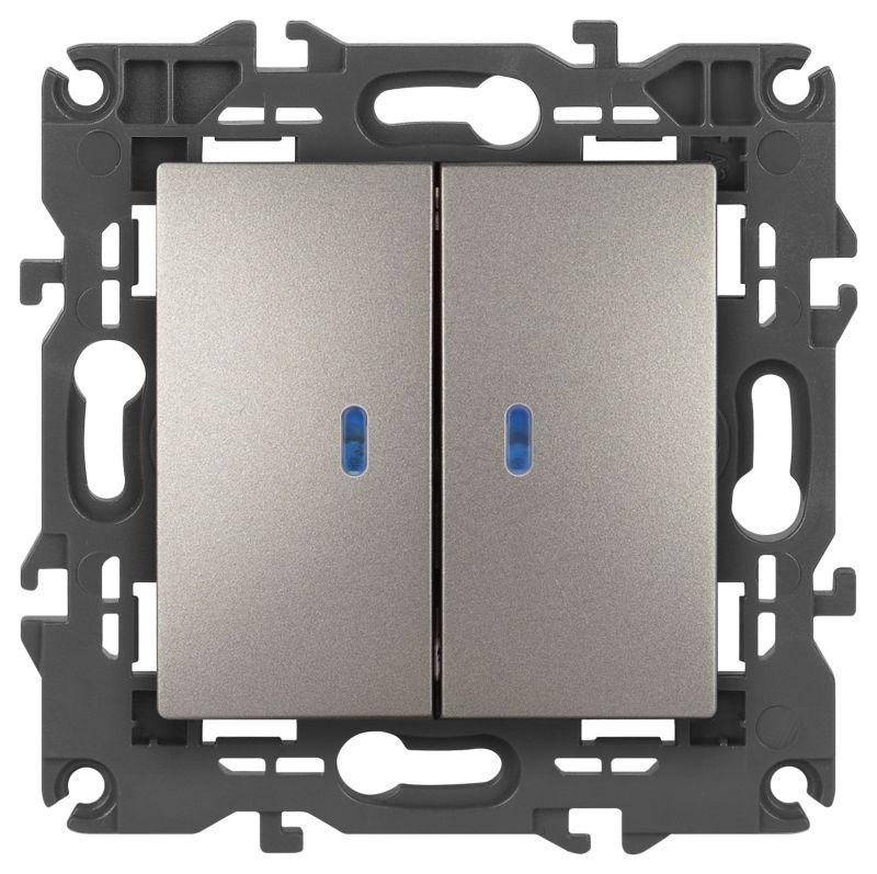 Выключатель 2-клавишный с подсветкой серии Эра Elegance цвет титан 14-1105-16. Характеристики 10А 250В. Оснащён автоматическими клеммами для надёжной фиксации жил кабеля в механизме. Рамки приобретаются отдельно.