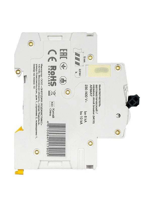 Автоматические выключатели ARMAT серии M10N предназначены для защиты цепей от перегрузки и короткого замыкания. Модельный ряд включает в себя устройства с характеристиками срабатывания B, C, D и номинальными токами от 0,5 до 63 А. Номинальная отключающая способность автоматических выключателей ARMAT серии M10N составляет 10 кА. Предельная отключающая способность варьируется в зависимости от номинала от 10 до 50 кА.
