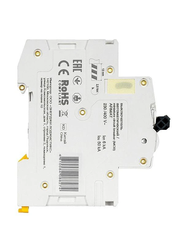 Автоматические выключатели ARMAT серии M06N предназначены для защиты цепей от перегрузки и короткого замыкания. Модельный ряд включает в себя устройства с характеристиками срабатывания B, C, D и номинальными токами от 0,5 до 63 А. Номинальная отключающая способность автоматических выключателей ARMAT серии M06N составляет 6 кА. Предельная отключающая способность варьируется в зависимости от номинала от 10 до 50 кА.