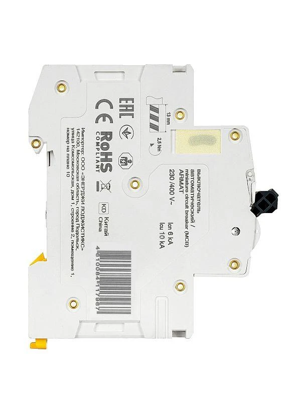 Автоматические выключатели ARMAT серии M10N предназначены для защиты цепей от перегрузки и короткого замыкания. Модельный ряд включает в себя устройства с характеристиками срабатывания B, C, D и номинальными токами от 0,5 до 63 А. Номинальная отключающая способность автоматических выключателей ARMAT серии M10N составляет 10 кА. Предельная отключающая способность варьируется в зависимости от номинала от 10 до 50 кА.