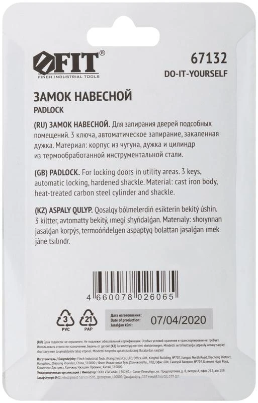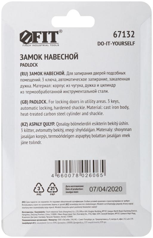 3 ключа. Автоматическое запирание. Материал: корпус из инструментальной стали, дужка из закаленной инструментальной стали. Упаковка: блистер.