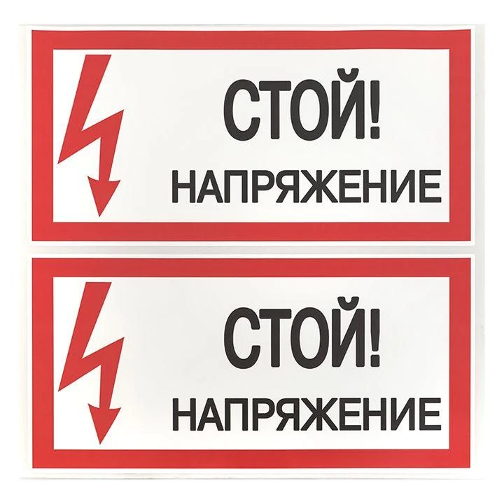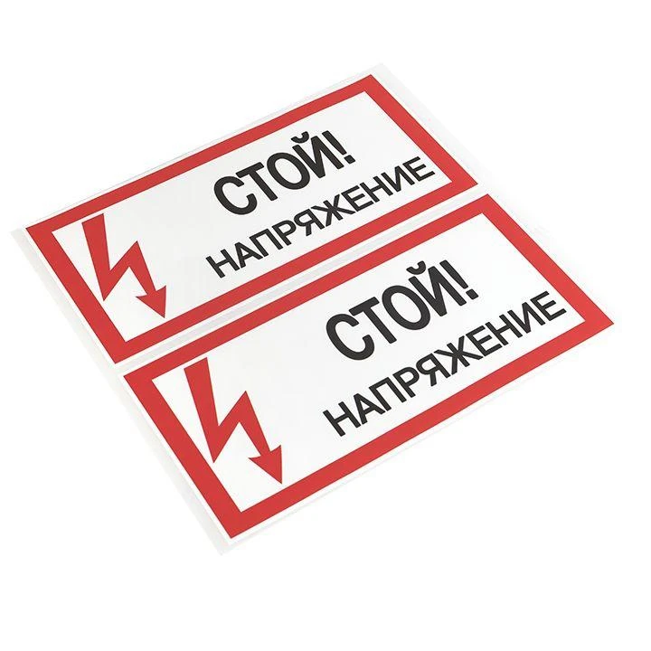 Представляет собой красный прямоугольный контур на белом фоне с с надписью черными буквами со знаком "молния" красного цвета. Изготовлен из самоклеящейся пленки.